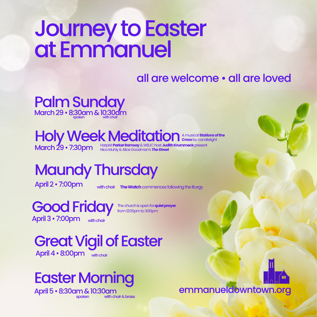 In the darkness that was Christ’s death, a new light is kindled, the story of our salvation retold, our baptism renewed, and the resurrection of Christ proclaimed for the first time. Join us for this moving liturgy, which culminates the first Eucharist of Easter. Click the photo to learn more about this service.